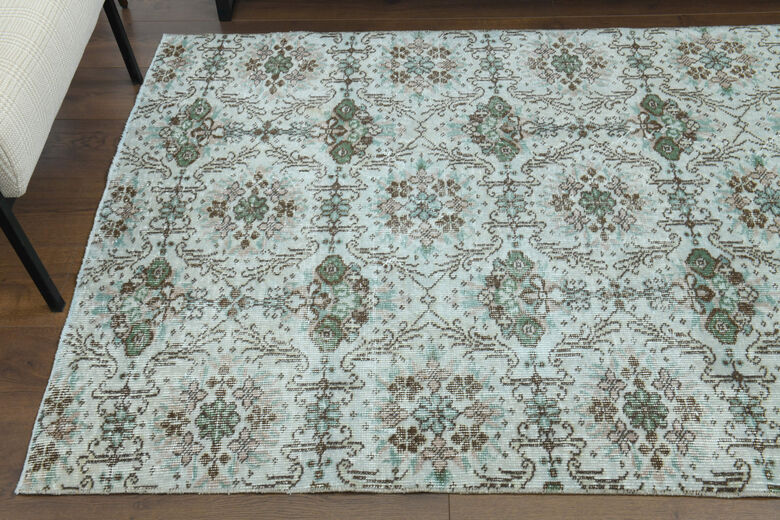 This one-of-a-kind vintage rug is hand-knotted and handwoven in Anatolia, Turkey from a unique wool blend.