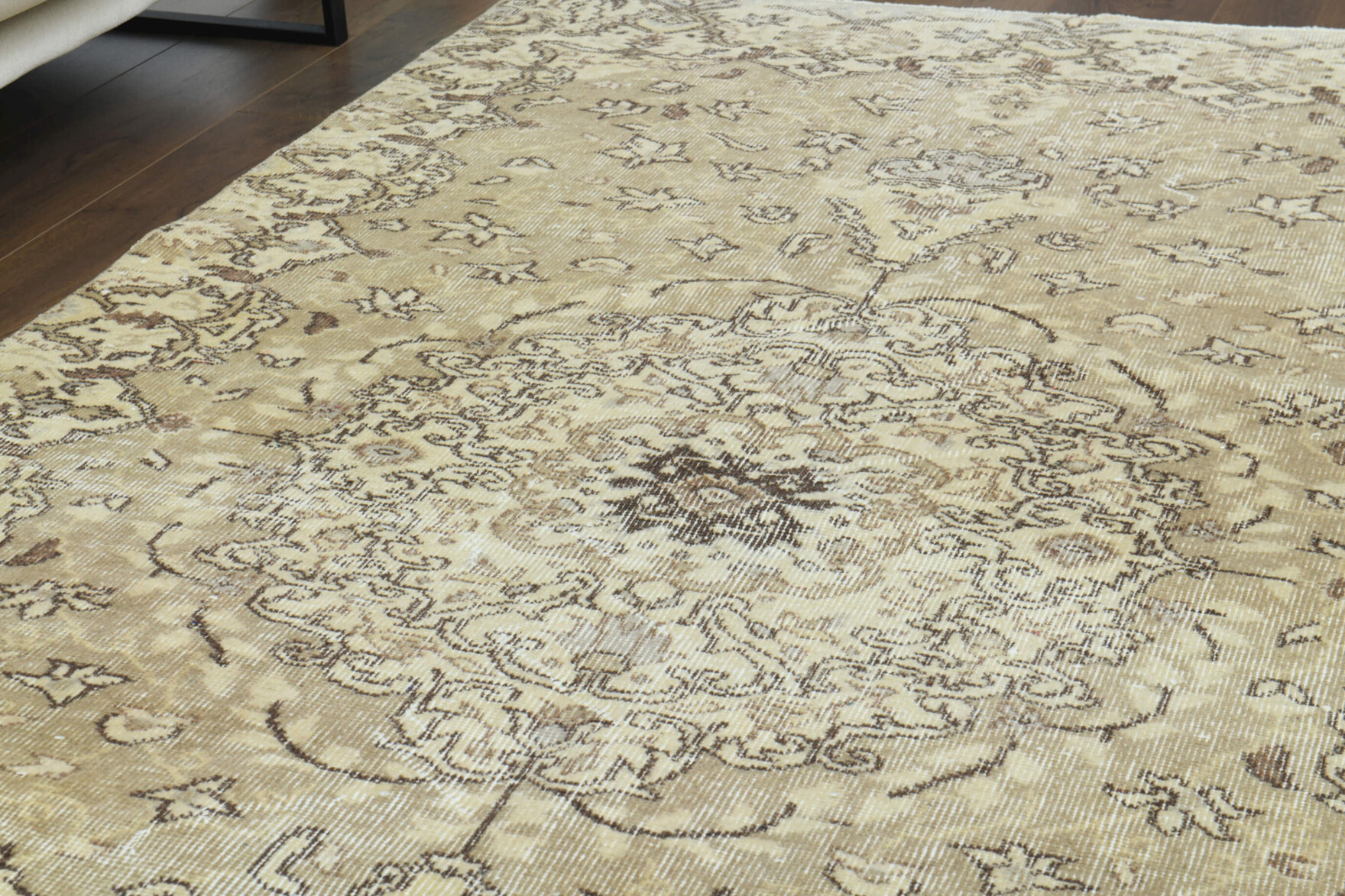 This one-of-a-kind vintage rug is hand-knotted and handwoven in Anatolia, Turkey from a unique wool blend.