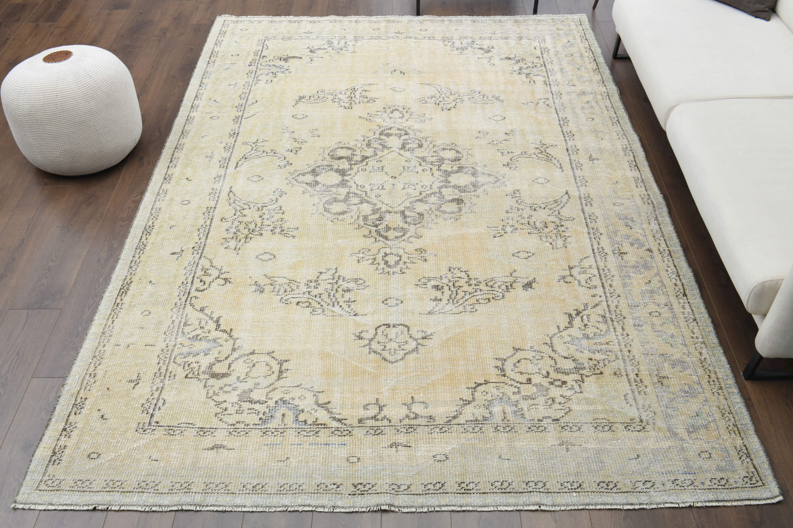 This one-of-a-kind vintage rug is hand-knotted and handwoven in Anatolia, Turkey from a unique wool blend.