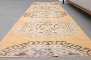 This one-of-a-kind vintage runner rug is hand-knotted and handwoven in Anatolia, Turkey from a unique wool blend.