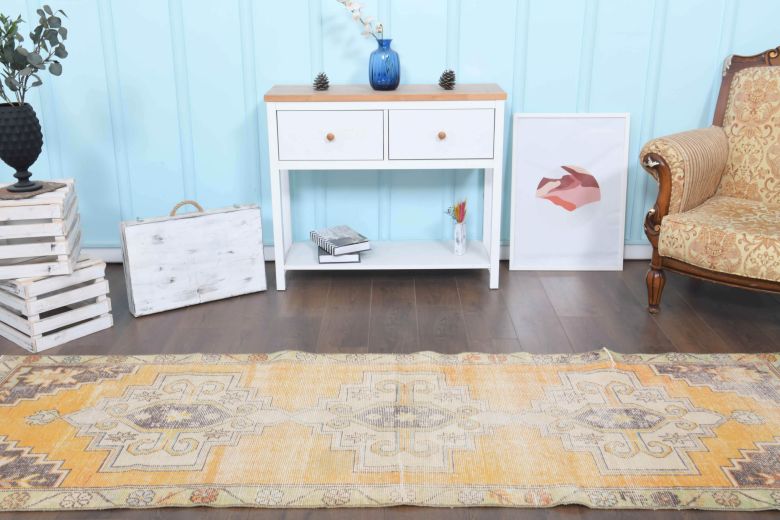 This one-of-a-kind vintage runner rug is hand-knotted and handwoven in Anatolia, Turkey from a unique wool blend.