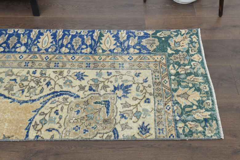 This one-of-a-kind vintage rug is hand-knotted and handwoven in Anatolia, Turkey from a unique wool blend.