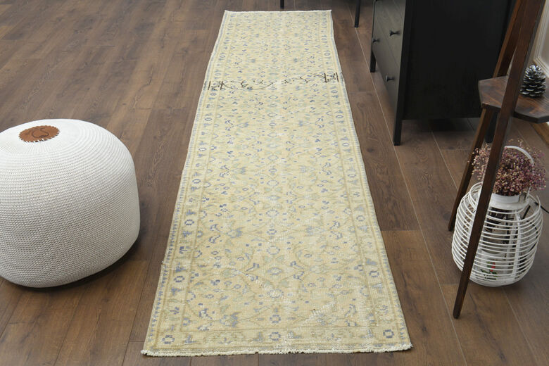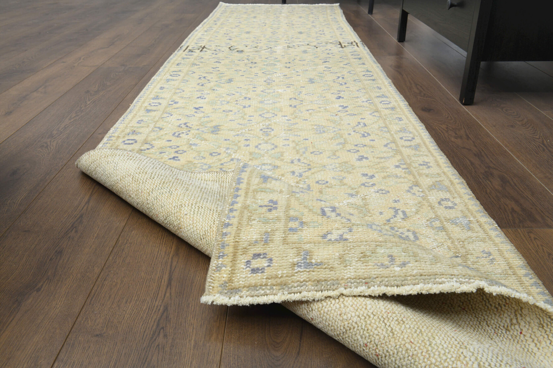 This one-of-a-kind vintage neutral floral runner rug is hand-knotted in Anatolia, Turkey from a unique wool blend.