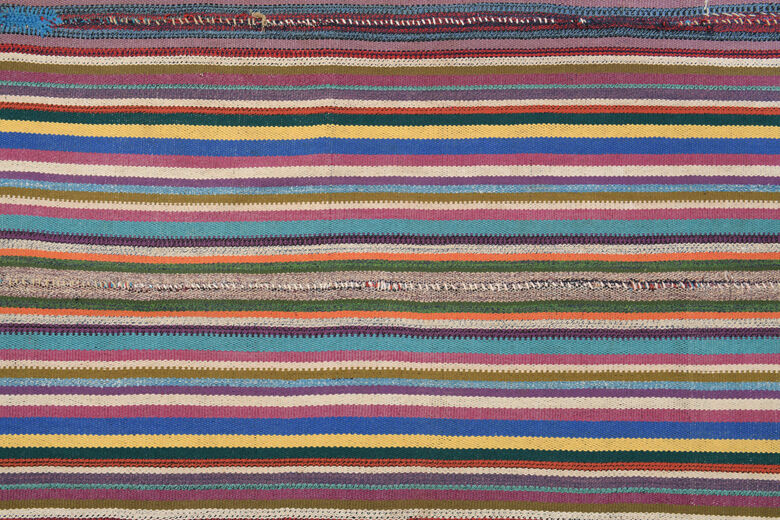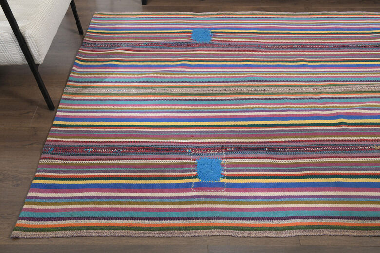 This one-of-a-kind vintage kilim rug is hand-knotted and handwoven in Anatolia, Turkey from a unique wool blend.