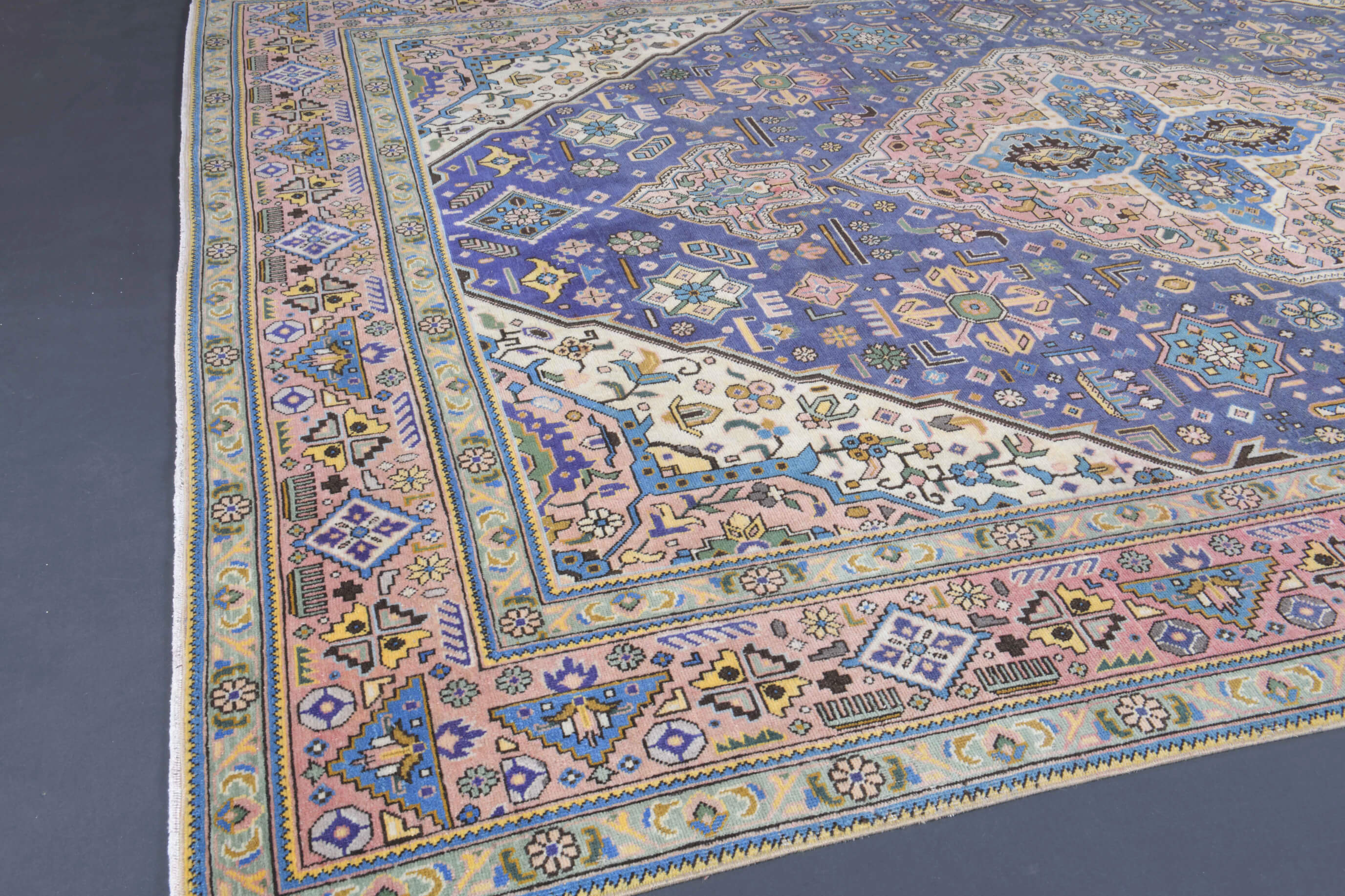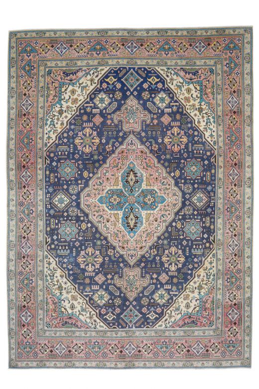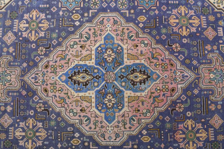 This one-of-a-kind oriental vintage rug is hand-knotted and handwoven in Persian from a unique wool blend.